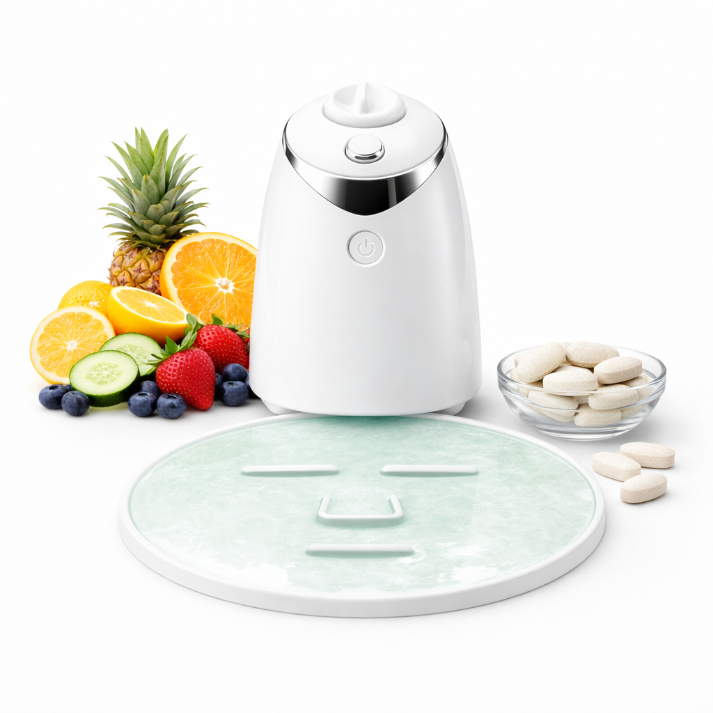 The GlowLabs Mask Machine transforms fresh fruits, vegetables, collagen tablets, and skincare ingredients into customized facial masks designed to hydrate, brighten, and refresh your skin.